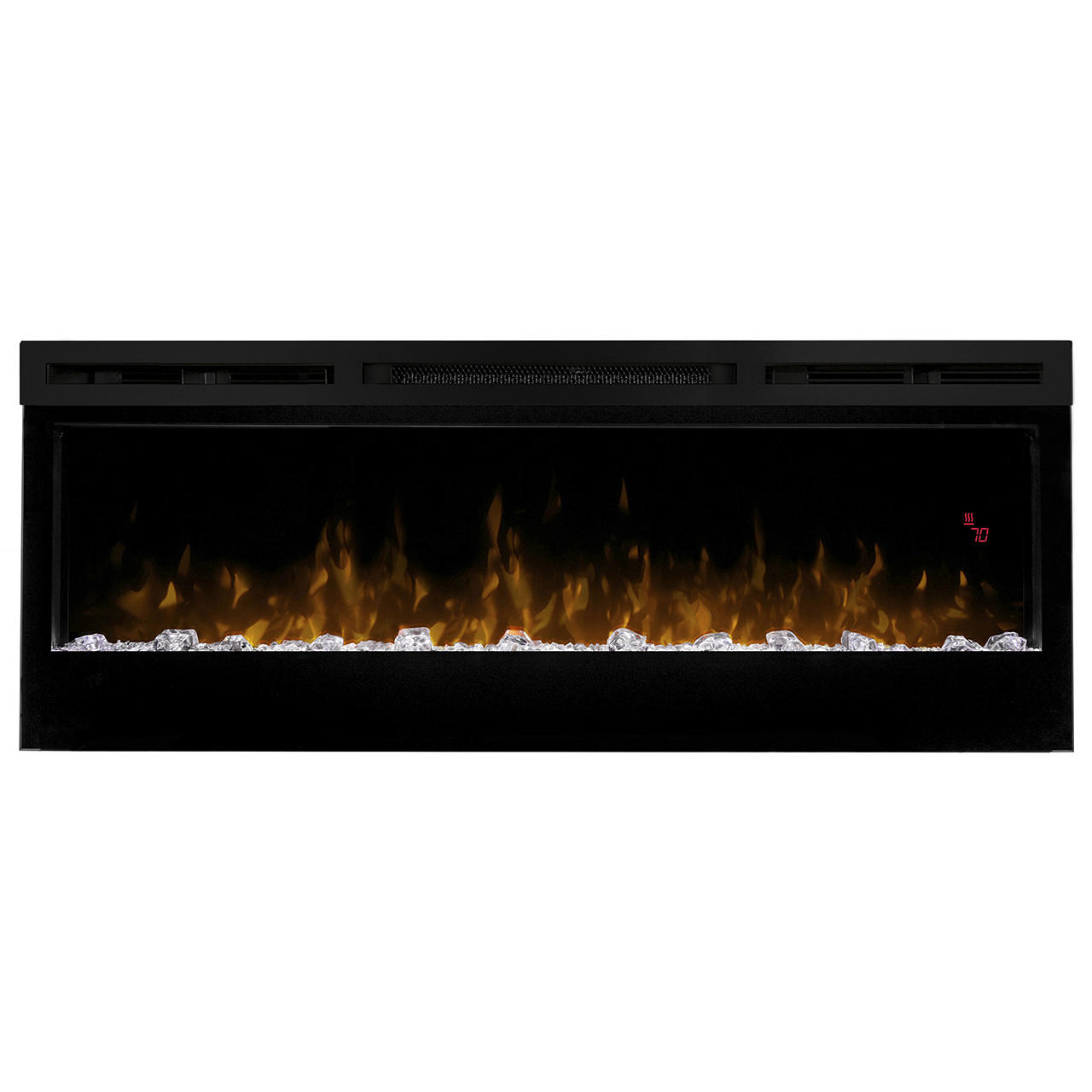 The Dimplex Prism 50" Linear Electric Fireplace - BLF5051 is the latest offering from the best-selling and award-winning BLF50 series. This upgraded electric fireplace has taken something great and turned it into something amazing. The unit's expansive 50-in width makes it a great focal point for your room, as it commands attention with its artistic beauty. The improved flame effect creates an even more realistic flame that perfectly dances from the upgraded, larger, diamond-like acrylic glass ember bed. With the addition of an LED lit ember bed, you can choose from any of the breathtaking choices - Blue, Green, Pink or Red. An integrated LED display easily depicts the temperature setting, sleep timer and color themes as you adjust them from the convenience of anywhere in your room using the included hand-held remote control. Since the flame effect can be run independently from the heater, you can enjoy this stunning fireplace year round. However, when the temperature does drop and your room needs additional warmth, the fan-forced heater easily produces supplemental heat to warm areas up to 400 Sq. Ft. The Prism offers versatility with 3 installation/mounting options. Choose from wall mount, partially recessed or fully recessed depending on your desired look. Additionally, you can select to direct-wire the unit into your electric grid or use the included standard wall outlet plug. The Dimplex Prism 50-Inch Electric Fireplace is truly a sight to see and will undoubtedly become a favorite feature of your home.