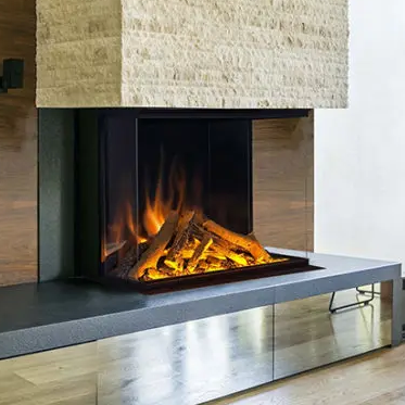 The E32 H: 3-Sided is a bay style trimless electric fireplace. Evoflame technology creates a robust flame effect while providing all the added benefits of an electric fireplace such as energy savings and installation flexibility.