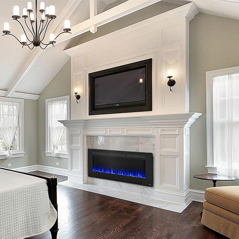 The Allure™ 60 Electric Fireplace easily adds shine and luxury to your space and perfect for the office, condos, and apartments, anywhere else a gas fireplace can't go. Imagine transforming a room simply by hanging something. You can do that with the Napoleon Allure™ 60 Electric Fireplace. No gas fitter required. With a touch of a button you are in complete control of the mood and temperature of your space. Adjust flame height, intensity and transition between cool blue, bright orange or a beautiful combination of the two as it sparkles out of the glass ember bed. The Allure™ 60" Electric Fireplace protrudes only 5" into your space when hung, but can be fully recessed into the wall as well.